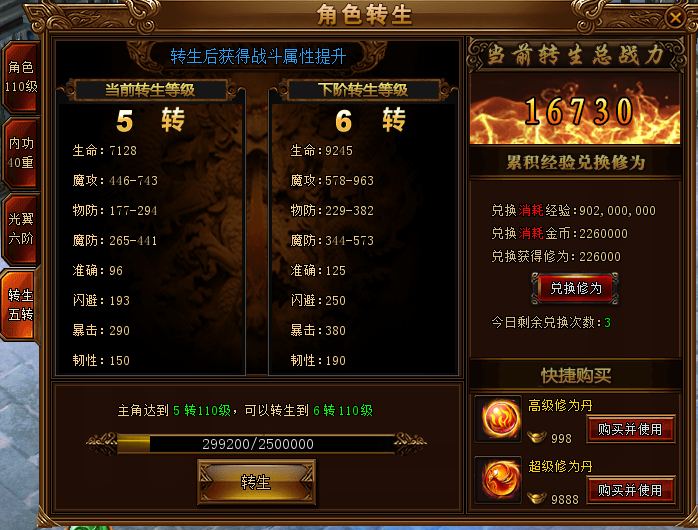 角色达到80级可开启转生系统,转生后可获得战斗属性的提升,同时可以穿戴更高级别属性的转生装备,并可进入有转生等级限制的高级地图探索。通过消耗主角的经验可以换取转生经验,也可通过商城购买修为丹使用提升转生经验。转生经验达到转生条件后,可进行转生操作,并提高转生等级。