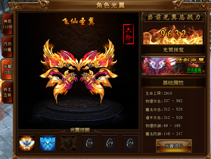 光翼系统可为主角提供炫酷的翅膀外观,同时培养光翼升级可以提升主角基础,并可激活特有的光翼技能。光翼每次进阶可变化为更炫酷的外观,进阶等级越高外观越炫酷。通过参与系统活动神羽副本或者商城购买神羽道具,可以进行光翼升级及进阶操作。