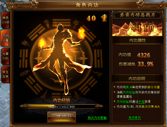 内功可以抵消角色受到的部分伤害,通过获取内功经验,并消耗内功经验可提升内功等级并获得更高属性。内功经验可通过杀怪获得,也可以通过参与泡点练功或者商城购买内功卷轴获得。内功值为0时,内功抵伤效果消失。