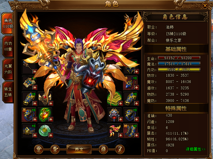 主角系统展示,包含:角色装备信息、角色信息显示、角色基础属性、角色特殊属性以及详细二级属性等,同时左侧为角色主要养成系统,包含内功系统、光翼系统、转生系统等。下方为角色符文系统以及角色套装激活系统。