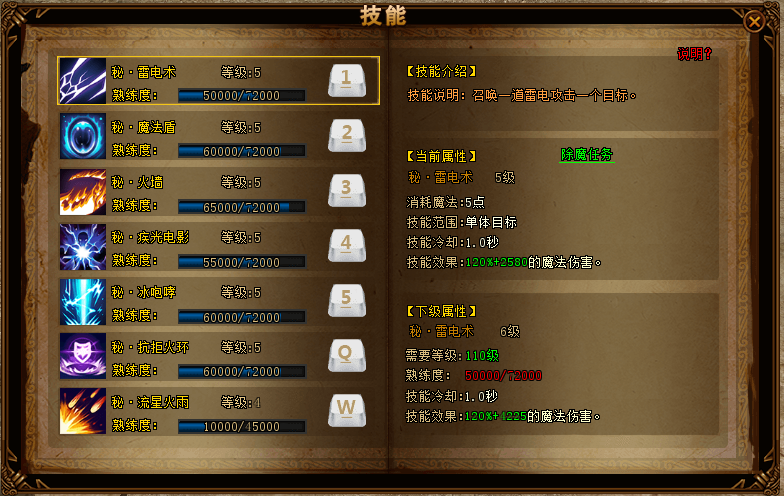 主角技能系统,通过主线任务提升等级,可开启主角技能。使用技能可获得技能熟练度,用于提升技能等级。同时通过获取并使用技能书也可以提高对应技能的熟练度。技能书可通过每日除魔任务获得,也可以通过商城购买或点券兑换直接获得。同时,在技能面板处可通过点击白色数字与字母按钮设置技能释放的快捷键,方便不同的操作习惯。
