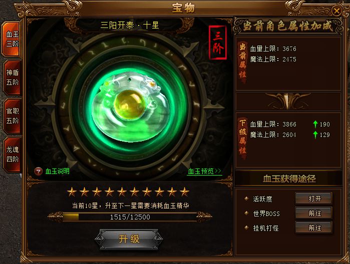 通过主线任务将开启宝物系统。宝物内有四个子系统,分为血玉、神盾、官职、龙魂。血玉可增加角色的生命和魔法上限,通过消耗血玉精华可对血玉进行升星,升星后将进一步提高对应的属性增益。通过噬魂系统、世界BOSS以及挂机杀怪都可以获得血玉精华,也可通过参与系统活动或者直接从商城购买血玉精华。