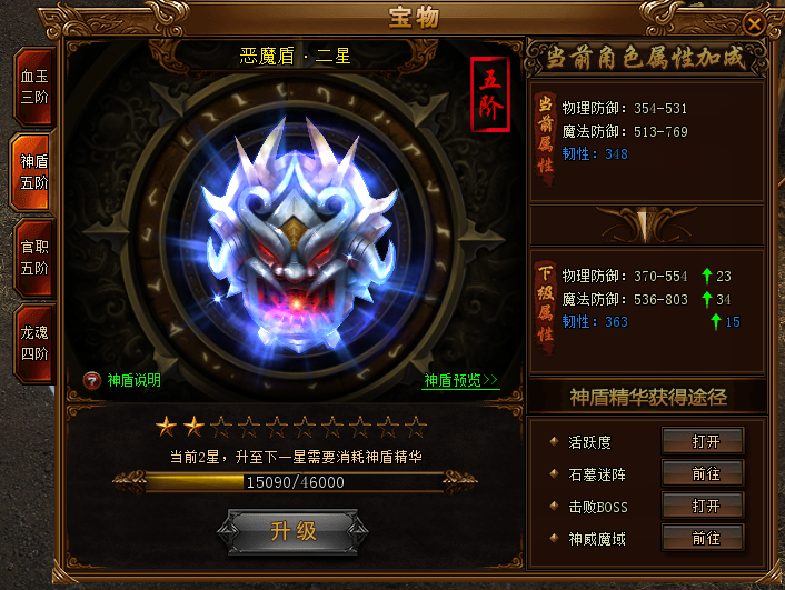 神盾可增加角色的防御、韧性和免伤属性,通过消耗神盾精华可对神盾进行升星,升星后将进一步提高对应的属性增益。通过参与噬魂系统、石墓迷阵活动、击杀野外BOSS及神威魔域活动都可以获得神盾精华,也可通过参与系统活动或者直接从商城购买神盾精华。