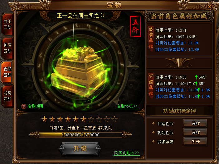 官职可增加角色的攻击属性、生命值和额外伤害属性,通过消耗功勋可对官职进行升星,升星后将进一步提高对应的属性增益。通过参与押镖活动、功勋任务、沙城争霸活动都可以获得功勋值,也可通过参与系统活动或者直接从商城购买功勋令并使用获得功勋值。
