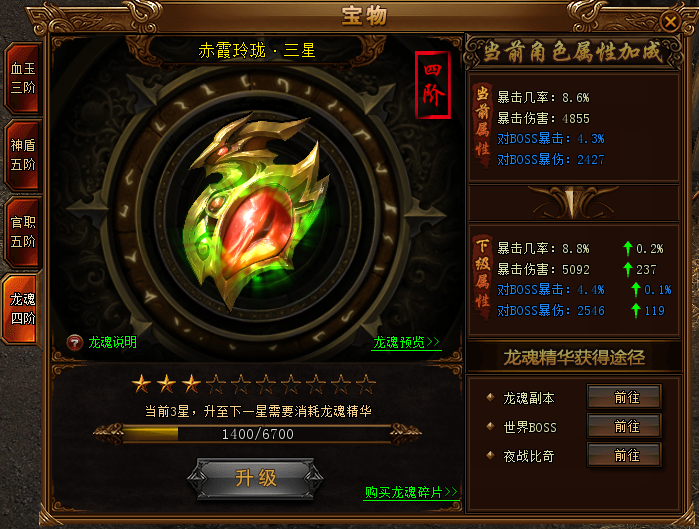 龙魂可增加角色的暴击率、暴击伤害属性,通过消耗龙魂碎片可对龙魂进行升星,升星后将进一步提高对应的属性增益。通过参与龙魂副本、世界BOSS、夜战比奇活动都可以获得龙魂碎片,也可通过参与系统活动或者直接从商城购买龙魂碎片。