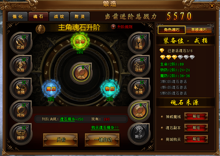 等级达到65级时,将开放装备栏位的魂石功能,针对主角以及英雄的单条属性进行培养与提升。主角和英雄在等级到达65级将首先开启武器栏位的生命魂石、物防魂石及魔防魂石。后续随着等级的提升,将开启更多的装备栏位的魂石功能,同时攻击魂石、爆伤魂石以及暴击魂石需要将魂石栏位进阶到一定等级后才可开启。升阶魂石需要消耗魂石精华,通过神威魔狱、魂石副本活动可活动魂石精华,也可通过商城直接购买并使用魂石精华。