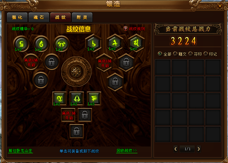 角色转生等级达到3转时,开启战纹功能。战纹分为雕文、符印、符记3大类,通过将不同的战纹镶嵌到不同的战纹栏位,以提高角色对应的各种属性增益。战纹品质分为优秀、精良、卓越、史诗和传说5种等级,等级越高属性越强大。战纹获取可通过在卧龙山庄地图打BOSS掉落获得,也可通过参与战纹活动中获得。回收战纹可获得战纹精华及少量金币,战纹精华可用于升级战纹等级,但其品质不会发生变化。类型相同的战纹只能镶嵌一块,根据自身不同的需求可灵活选择。