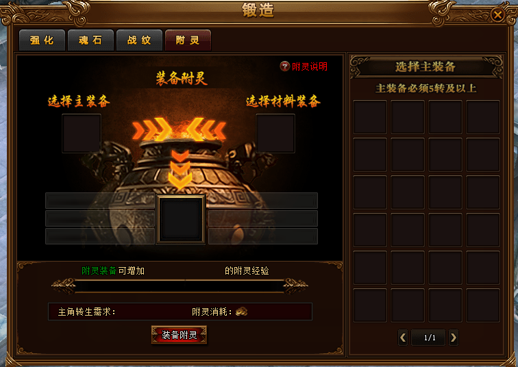 服务器开服30天,角色等级达到5转时,将开启附灵功能。5转及5转以上的装备通过吞噬3转及以上等级的装备可以进行附灵升级,以提升原有装备的基础属性。装备的附灵等级上限为15级。