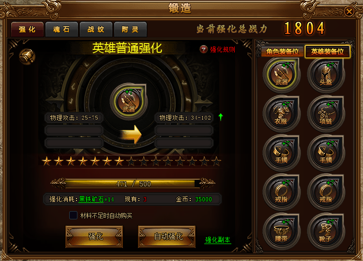 强化系统可用于强化主角以及英雄的装备部位。强化获得的属性会永久保留,不会根据装备的替换而变化。强化需要消耗强化石,且强化到15星后,需要使用高级强化石(玄铁矿石)继续对装备部位进行极致强化。强化有失败概率,失败时增加强化的祝福值,祝福值满时下一次强化必定成功。强化石可通过强化副本或商城购买获得。