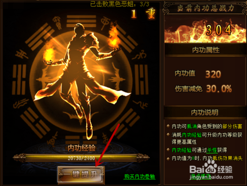 5.之后我们点击下方的【一键提升】按钮,就会消耗内功经验,增加下面的进度条,当进度条满格后,就能提升内功,如图所示。