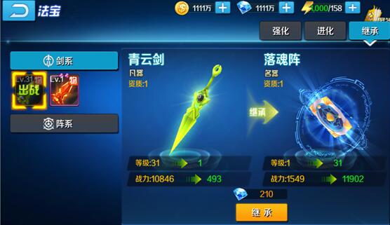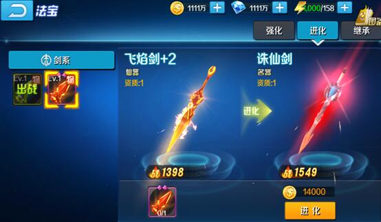 低等级的法宝可以继承高等级法宝的等级,不过这个操作需要花费一定钻石。