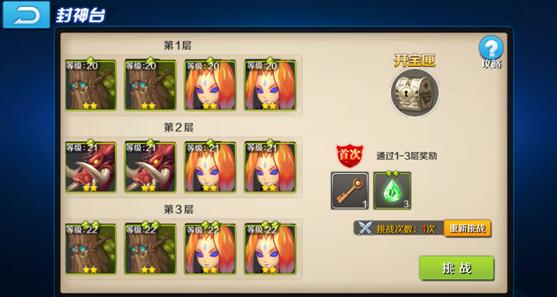 随着宝石功能开启,试炼副本中的封神台也同步开启,玩家可前往挑战,每层首次通关可额外获得高级宝石。玩家每日可重置封神台,且已通关关卡可扫荡快速完成获得大量宝石奖励。