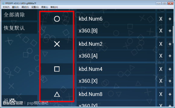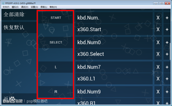 红框里面的就是psp按键一般来说 psp游戏只要把上面所有键位都设置好了游戏的操作就没有问题了