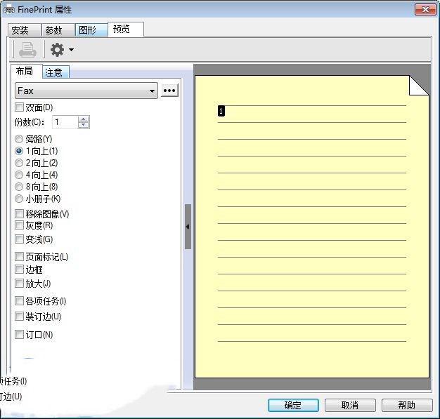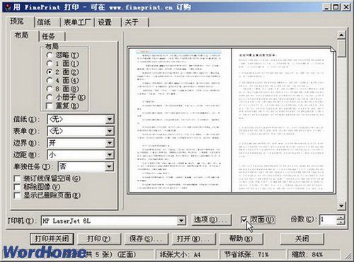 你可以在打印FinePrint对话框中选择“双面”或1面到8面打印,这样一张纸就可以打印更多的内容,为你节省大量的纸张,一般情况如果我们要打印双面可多面得通过手工去处理,特别是打印一些小册子,得自己设计好,安排好页码,然后再一张一张地拼,一不小心可能还弄错页码及顺序,如果有了FinePrint你只需选中“预览”中的“小册子”,一切只需交给FinePrint来处理,让你打印小册子这类的操作变得轻松自如。