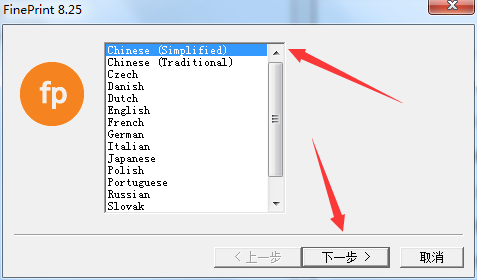 1、解压下载好的fineprint打印驱动安装包,选择【中文(简体0】安装语言后单击【下一步】。