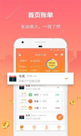 首页账单:支出收入,一目了然快速记账:分类记账,一步到位