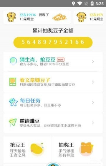 在生肖豆app只要您有手机,就能随时随地轻松参与。既可以利用闲暇时间,每天几分钟,体验广告做任务;此外在生肖豆app还可以猜生肖,拼人品获得抽取大奖的机会;同时邀请小伙伴为您打工,加入站长合作联盟更可直接提现到支付宝!
