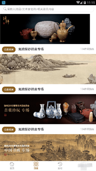 璟祥拍卖app隶属于璟祥拍卖公司,包含直播功能,用户可以用手机在线上参加拍卖会,分别包括实时拍卖和限时拍卖,有看中的书画,瓷器等艺术品可以实时出价参加拍卖。