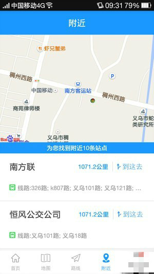 义乌出行通app可以查询当前位置附近站点及经过站点的公交线路列表。