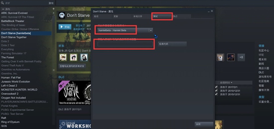 打开steam,选中Don't Starve,右键选择属性,测试栏,
