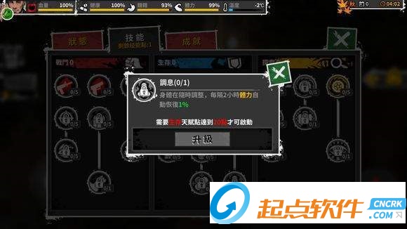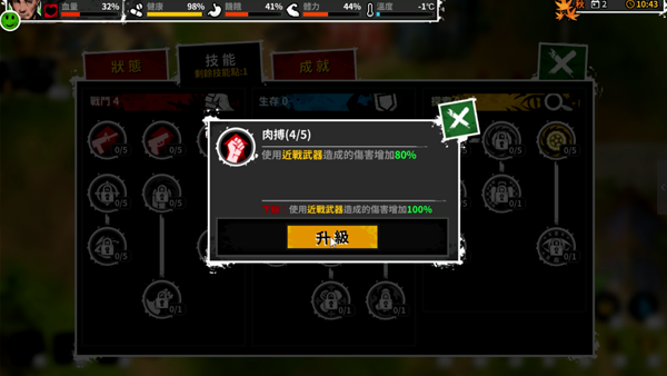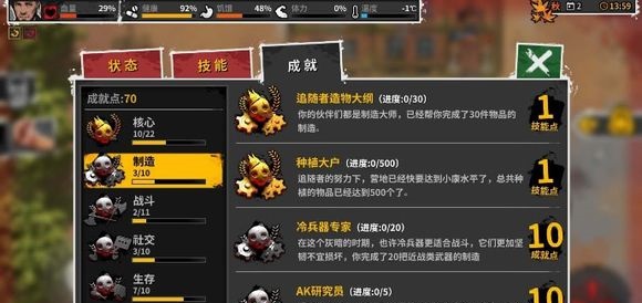 而且玩家在达成某些特定的成就还可以获得一些技能点,通过升级技能点来让自己的能力获得大幅的增强。技能分为三个板块——战斗、生存抑或是探索,技能前期点数不会很多,如何加点主要取决于玩家的策略——是直接与丧尸硬碰硬;还是利用走位巧妙的躲避丧尸,降低消耗,然后收集更多的材料。