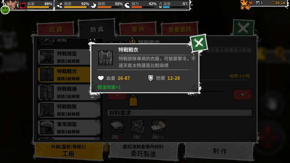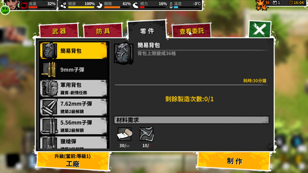 为了生存的更久,你需要更多的物资,利用它们制造你需要的武器和装备,这样你在接下来的日子中才可能有更多续航能力去寻找新的资源。