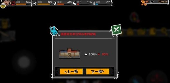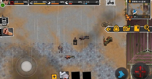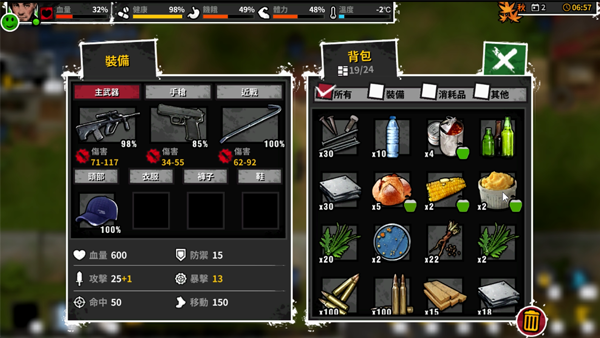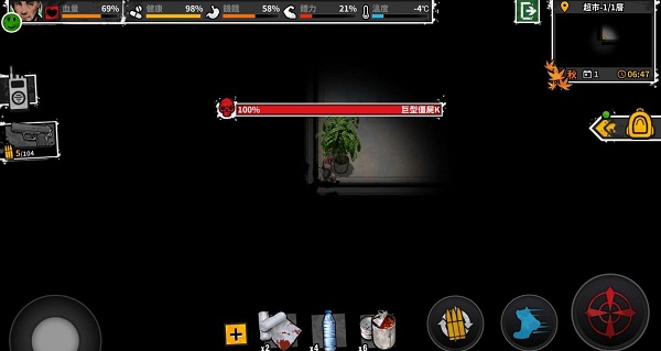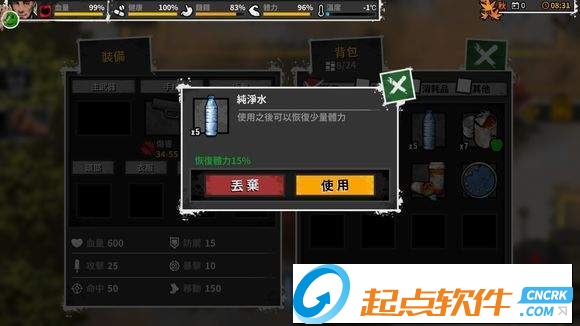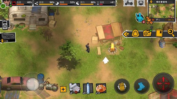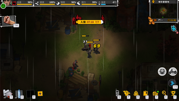 失血可以用绷带止血,饥饿过度就需要一些食物补充,下雨感冒后温度过低可以喝点威士卡提升体温,或者到屋子里面等待升温。祛除了身上的debuff之后,你就能够在营地里的房车安心的补血了。