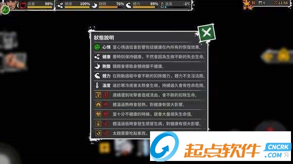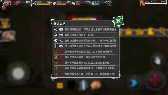 游戏有着五种身体状态的设定,有血量,健康,饥饿,体力,温度。如果过于饥饿,或者体温过低超过一段时间,将会影响健康值,而健康值过低,将会持续的掉血,玩家需要注意保暖并及时补充食物能量。如果体力值过低,玩家就只能走路而不能奔跑,探索将会花费更多的时间。另外招募的追随者如果过于恐惧还会逃跑。