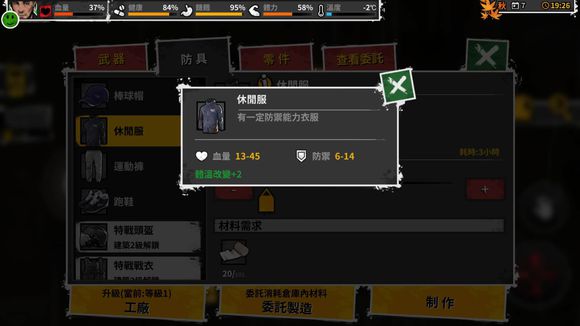 如果你足够幸运能在游戏中存活一段时间,等到秋天过去冬天来临,温度下降,环境开始影响健康值时,那时就要好好的考虑下如何在寒冷的冬天里继续存活了。迷城重生中冬天室外会变得极度的寒冷,温度降低会影响人物的健康值和血量,你必须要做好一些防寒的准备。休闲服和运动裤就能够小幅度的提升人的体温,需要的材料不多,20匹布就能制作。