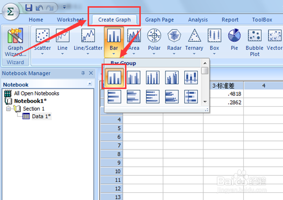 点击工具栏“Create Graph”,选择我们想要做出的图形,小编这里就以简单的柱形图示例,如图五。
