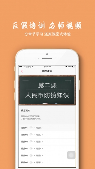 平台内容:包含各种本外币的柜面防伪识别、反假考试的培训学习和报名、多种柜面业务操作技巧、商行法律法规及相关银行资讯等;线上学习:以书籍教材、名师讲堂、音视频学习、动态ppt播放等形式,将培训内容按章节细分,利用碎片式时间进行学习,自主挑选学习内容和学习频率,再不用为下班后的集中培训而苦恼;