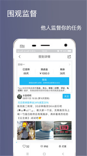 发起目标:发起一个目标计划,并缴纳一定的押金,邀请你的好友来监督你,平台的其他用户也会加入对你目标计划的关注和监督。成功则返回押金,失败则押金分给围观者。打卡:目标发起后,每天完成目标计划并进行打卡,可以进行文字图片等形式打卡并叙述您的感受。