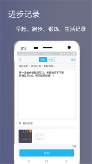 打卡:目标发起后,每天完成目标计划并进行打卡,可以进行文字图片等形式打卡并叙述您的感受。