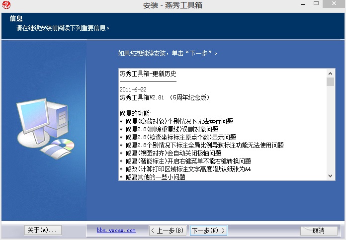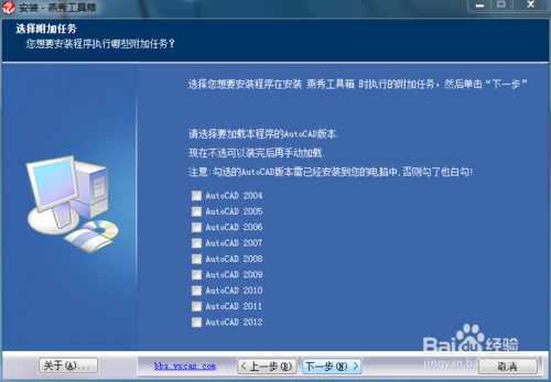 如何在高版本AUTOCAD中加载燕秀工具在安装燕秀工具箱时,会出现如下的对话框,要求我们选择电脑上已经安装好的AUTOCAD软件的版本。由于工具箱最高只能自动加载到AUTOCAD2012版本,所以在这里我们不用勾选,直接按下一步进行。完成安装后关闭。