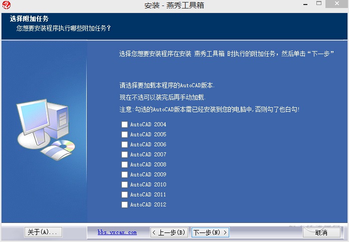 在安装燕秀工具箱时,会出现如下的对话框,要求我们选择电脑上已经安装好的AUTOCAD软件的版本。由于工具箱最高只能自动加载到AUTOCAD2012版本,所以在这里我们不用勾选,直接按下一步进行。完成安装后关闭。