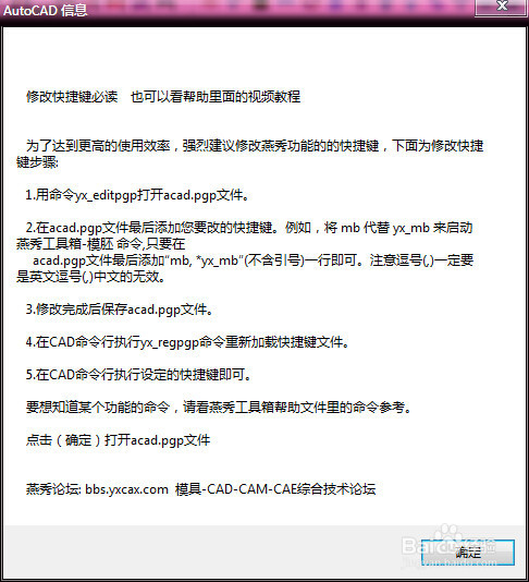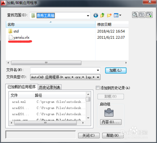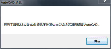 在上一步中我们已经找到yanxiu.vlx文件,双击进行加载,如出现提示框告诉我们燕秀工具箱已经加载成功。