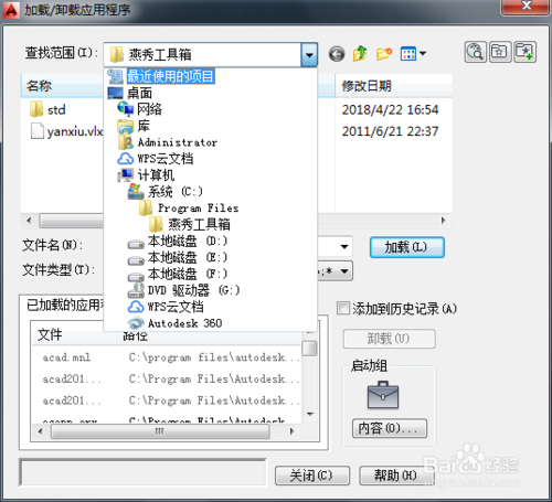 启动AUTOCAD2014软件,在菜单栏找到“管理”,再在下拉中找到“加载应用程序”,进行点击进去。找到刚才燕秀工具箱安装的根目录。我的是安装在C盘/program files/燕秀工具箱/yanxiu.vlx。