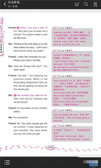 乌龙英语app内容全部为中英文对照,以真实对话的形式再现了乌龙大师的经典错误,解释乌龙英语的种种前因后果,条条来龙去脉,分析其想要表达的真实含义,给出地道的正确说法,同时还旁征博引,引经据典,补充相关文化、词汇知识,让你知其然,并知其所以然!