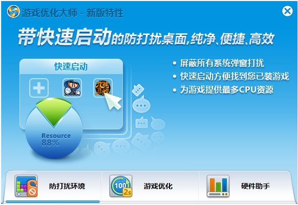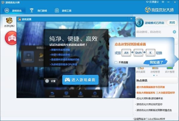 相信很多朋友在玩游戏的时候,都会遇到弹窗,打团战的时候结果被弹出去了,然后就团灭了,那叫一个蛋疼。如果你经常遇到这种情况,不如下个游戏优化大师游戏桌面试试吧,有了游戏桌面,广告都被弹弹弹走了!妈妈再也不用担心你的游戏了~噢耶。下面我们一起来看看游戏桌面工具使用教程吧。