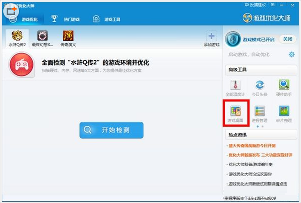 1、第一步、打开游戏优化大师,点击右边“高级工具”栏目下的“游戏桌面”。