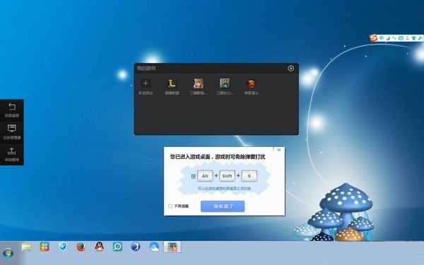 防打扰游戏桌面:游戏时切换到防打扰游戏桌面,屏蔽Win键弹窗、系统升级通知、防火墙通知等一切打扰,给用户最纯净的游戏环境。