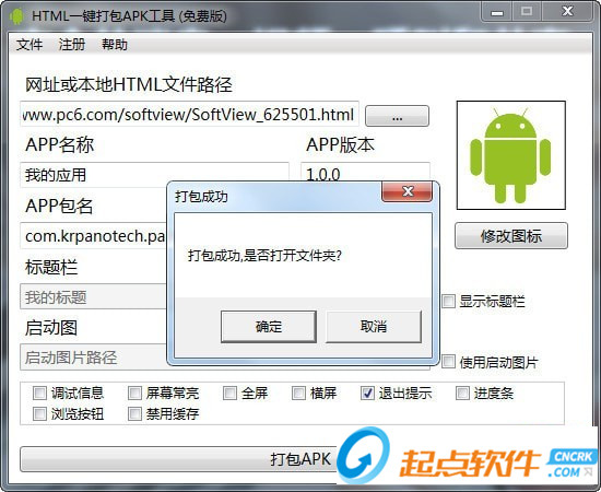 3.支持自定义图标,自定义APP名称,自定义包名,全屏,横屏,退出提示,保持常亮等选项