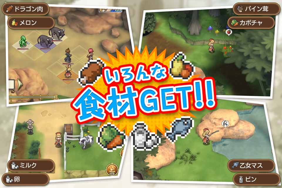 食材可以在迷宫中採集,也可以通过打败怪兽掉落。用多种手段收集食材来製作料理吧。能做出的料理有600种以上