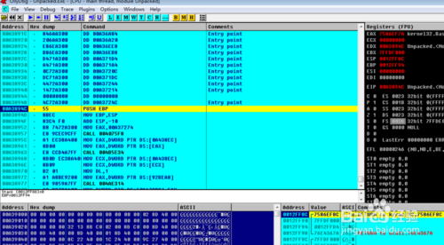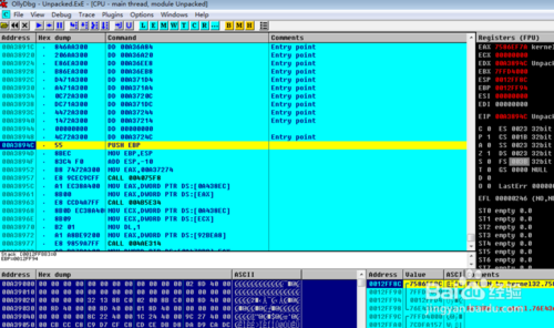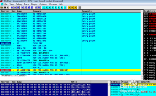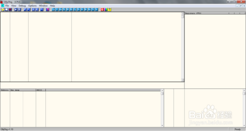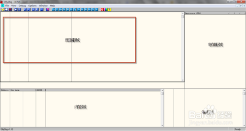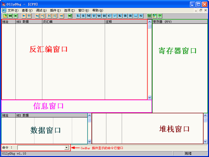 打开ollydbg,会看到这几个基本界面,我的定制化了一些插件,会有些出入。不过基本一致的。