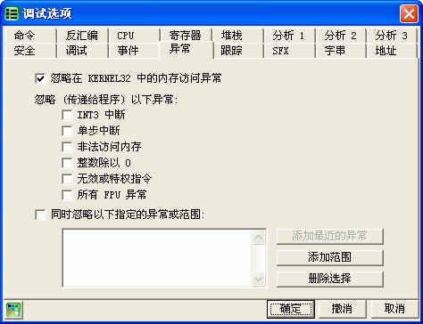 新手一般不需更改这里的选项,默认已配置好,可以直接使用。建议在对 OllyDBG 已比较熟的情况下再来进行配置。上面那个异常标签中的选项经常会在脱壳中用到,建议在有一定调试基础后学脱壳时再配置这里。