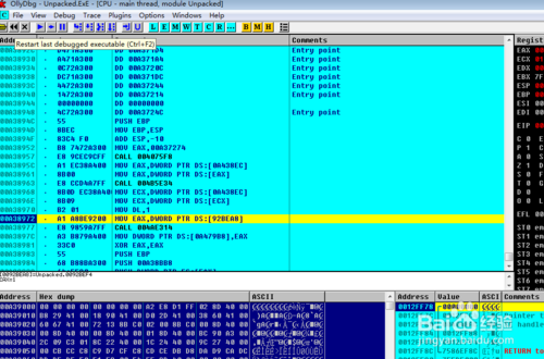 数据格式:OllyDbg 的数据窗口能够显示的所有数据格式:HEX、ASCⅡ、UNICODE、 16/32位有/无符号/HEX整数、32/64/80位浮点数、地址、反汇编(MASM、IDEAL或是HLA)、PE文件头或线程数据块。