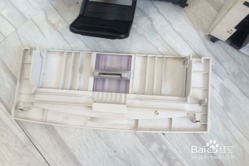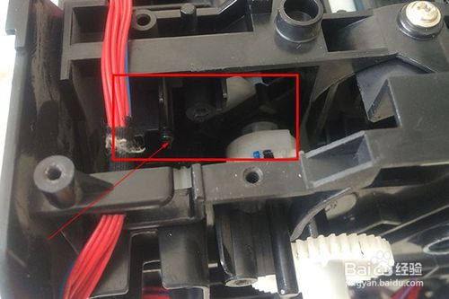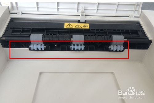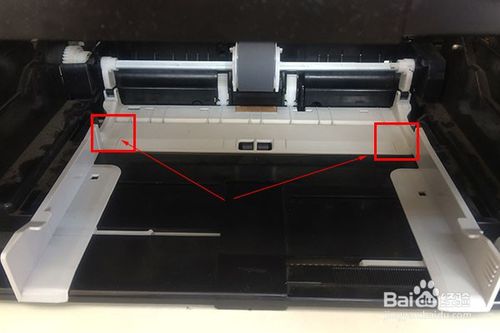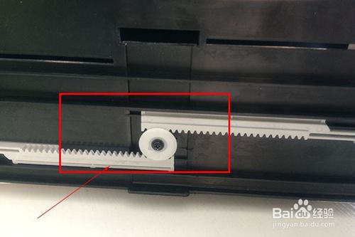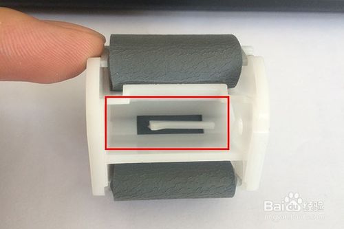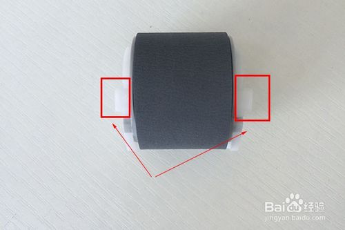 10.这里说一下搓纸轮的更换,如图所示,搓纸轮这两个位置的卡扣用镊子或者扁螺丝刀撬开,把搓纸轮向后推,即可拿下来。然后把新的搓纸轮上上,上的时候使劲推,一定要上到位,上完后和没拆下来时是一样的,卡扣要卡住。