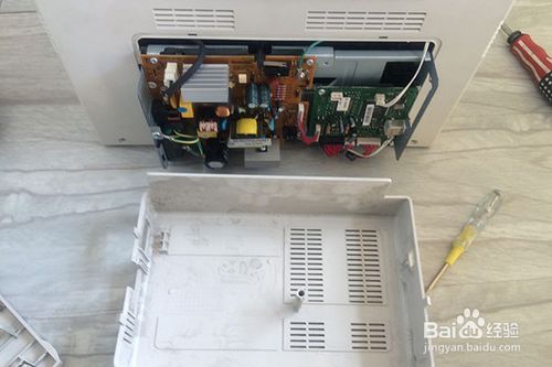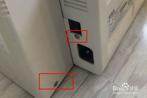 3.把打印机调过来,后面有四个螺丝,都拧下来,然后卸后面凸出的小盖子,这个盖子也是卡扣的,用扁螺丝刀轻轻撬一下,就卸下来了。