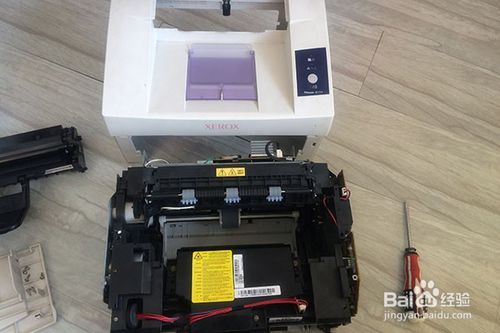 11.最后,就是把打印机装好了,这里就不在叙述了,安装拆的时候的记忆和螺丝对应的位置装好即可,装的时候过程尽量要轻,避免那些地方的线卡住,还有一下需要注意的是,出纸轮那里,不要卡住,如果卡住机器开机是不能自检成功的。(一定要把所有的外壳装好,包括硒鼓,安这个硒鼓时一定要冲到底。正面盖板以及顶上出纸处盖板合好,因为这款打印机盖板接触的地方有两个的微动开关。)