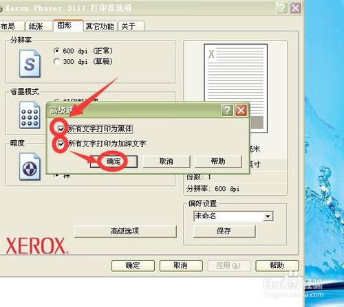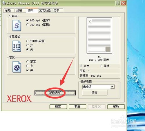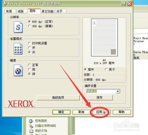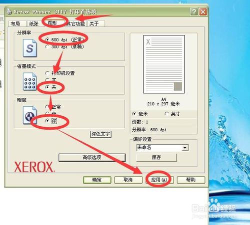 3.在弹出的界面中点按图形选项卡,按下图设置分辨率、省墨模式和暗度,然后点按应用。